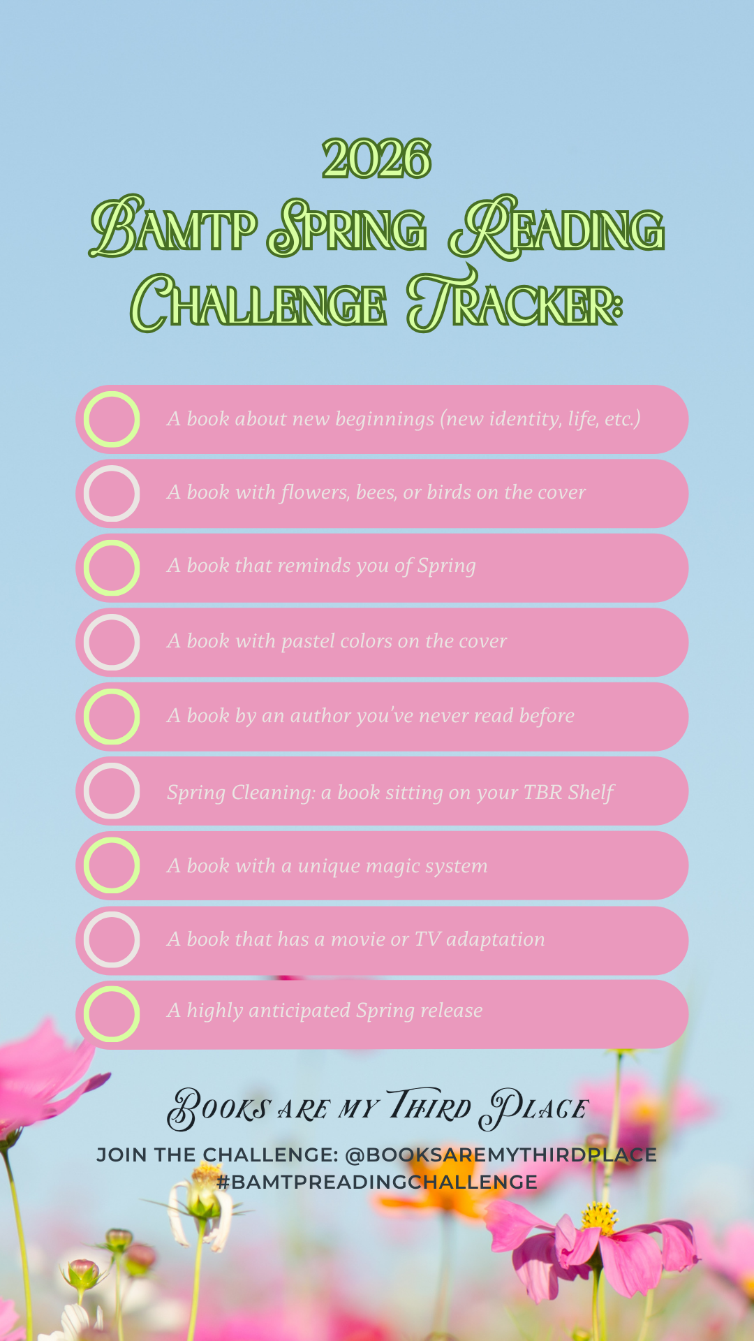 Spring is one of my favorite seasons, and not just because my birthday happens to land in late Spring, but there’s more light, which means I somehow am more productive. In winter, I swear I’m a bear and just want to hibernate. So Spring feels like a reset, like I’m shedding bad things, dark days, and cold. There’s new growth everywhere, people seem a little more happy, and of course, there’s always new book releases to look forward to! If you’ve been wanting to incorporate more fiction books in your life, and you’ve had a slow start to the year, consider this your open invite to join the BAMTP Spring Reading Challenge! We’ve done Summer reading challenges for the last few years, but the community has been asking for them more often, so in 2025, we started doing quarterly challenges. If fantasy and sci-fi books are your favorite genres, and you’re wanting to make some more book friends from around the world, we hope you’ll join in! P.S. Yes, it’s completely free to join.
